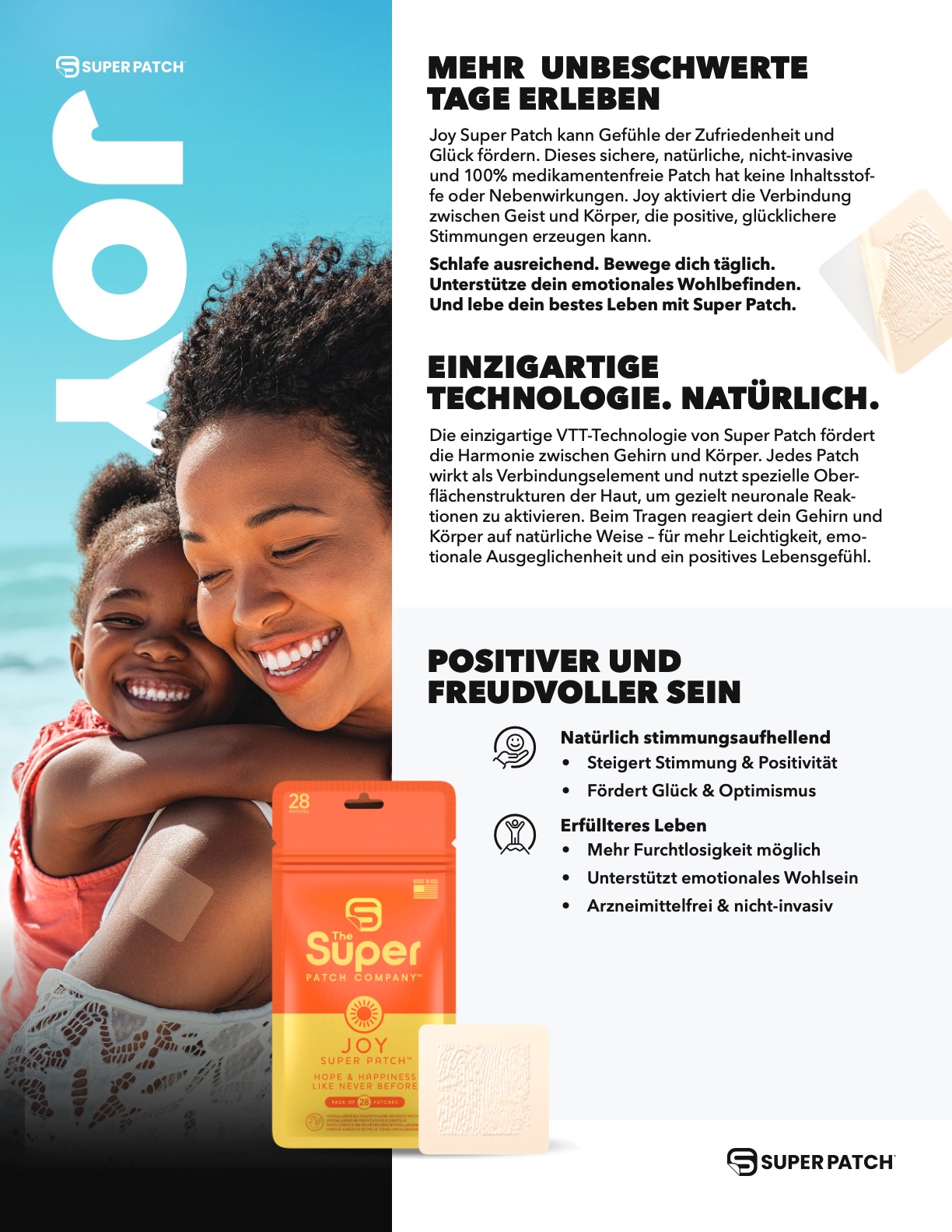 JOY Super Patch kann Gefühle der Zufriedenheit und Glück fördern. Dieses sichere, natürliche, nicht-invasive und 100% medikamentenfreie Patch hat keine Inhaltsstoffe oder Nebenwirkungen. JOY aktiviert die Verbindung zwischen Geist und Körper, die positive, glücklichere Stimmungen erzeugen kann.