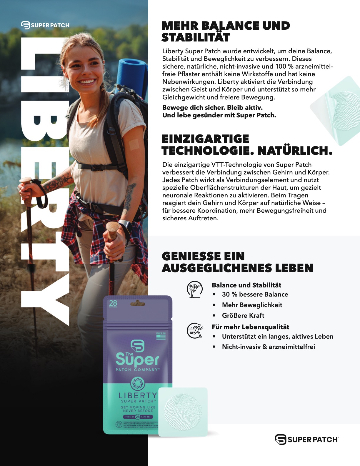 LIBERTY Super Patch wurde entwickelt, um deine Balance, Stabilität und Beweglichkeit zu verbessern. Dieses sichere, natürliche, nicht-invasive und 100% arzneimittel-freie Pflaster enthält keine Wirkstoffe und hat keine Nebenwirkungen. LIBERTY aktiviert die Verbindung zwischen Geist und Körper und unterstützt so mehr Gleichgewicht und freiere Bewegung.