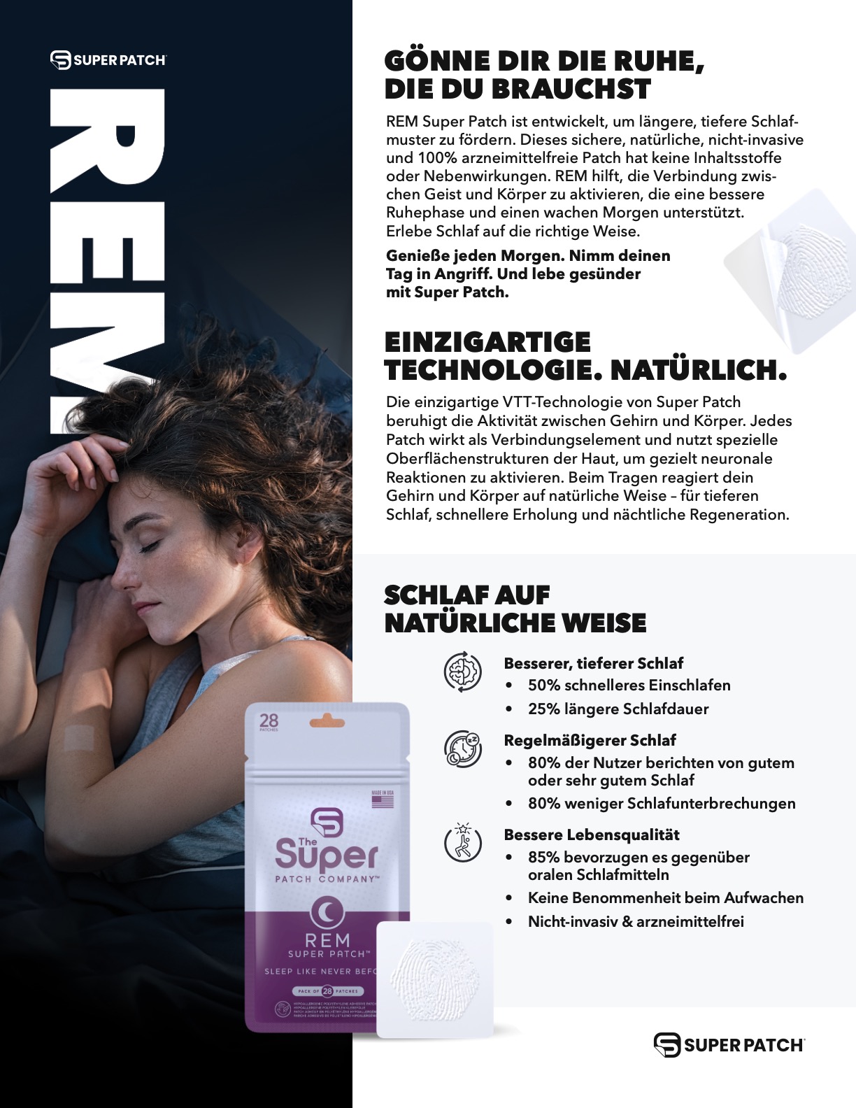 REM Super Patch ist entwickelt, um längere, tiefere Schlaf-muster zu fördern. Dieses sichere, natürliche, nicht-invasive und 100% arzneimittelfreie Patch hat keine Inhaltsstoffe oder Nebenwirkungen. REM hilft, die Verbindung zwischen Geist und Körper zu aktivieren, die eine bessere Ruhephase und einen wachen Morgen unterstützt. Erlebe Schlaf auf die richtige Weise.